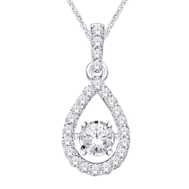 This Lavish Pendant Expertly Crafted In 10K White Gold And Set With Shimmering 1/4 Ct.Tw. Diamonds. The Center Diamond Features Unique Setting That Moves With Every Beat Of her heart. This Lavish Pendant Expertly Crafted In 10K White Gold. The Center Diamond Features Unique Setting That Moves With Every Beat Of her heart. The pendant sways from an 18 inch Cable chain that fastens with a spring ring clasp.