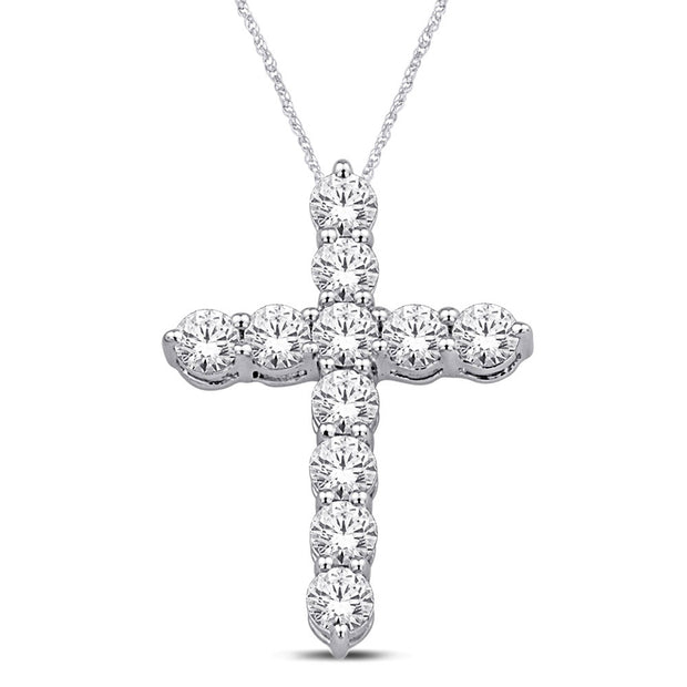 This beautiful pendant is available in 14K White Gold. There are 11 round / tapper diamonds with a total carat weight of 3/4 Ct.Tw. set in a shared prong setting.