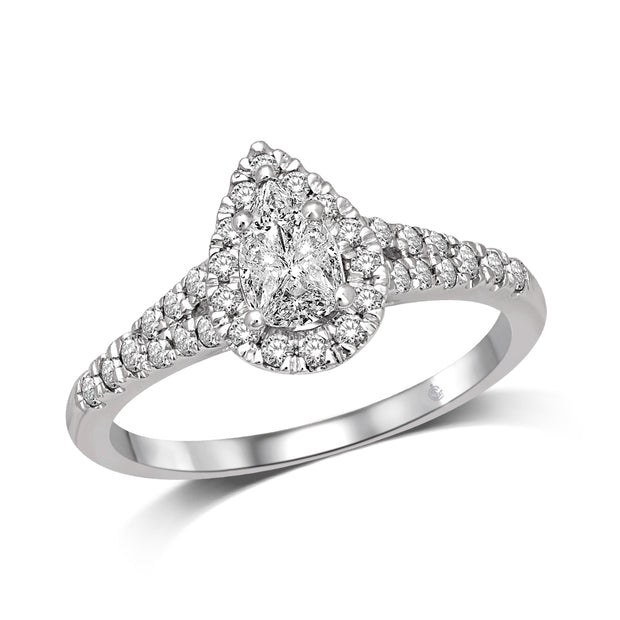 Fashioned In 14K White Gold, This Twist Shank Engagement Ring Feature Pear Shape Solitaire Which Gives Perceived Look And Frame Of Smaller Round Accent Diamonds Surrounds This Center. Additional Round Diamonds Of Line The Ring?s Shank, total diamond weight 9/10 Ct.Tw.